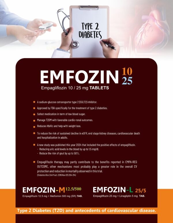 Use: EMFOZIN-25 is an SGLT2 inhibitor indicated for the management of type 2 diabetes mellitus, reduction of cardiovascular death risk, treatment of heart failure, and management of chronic kidney disease.