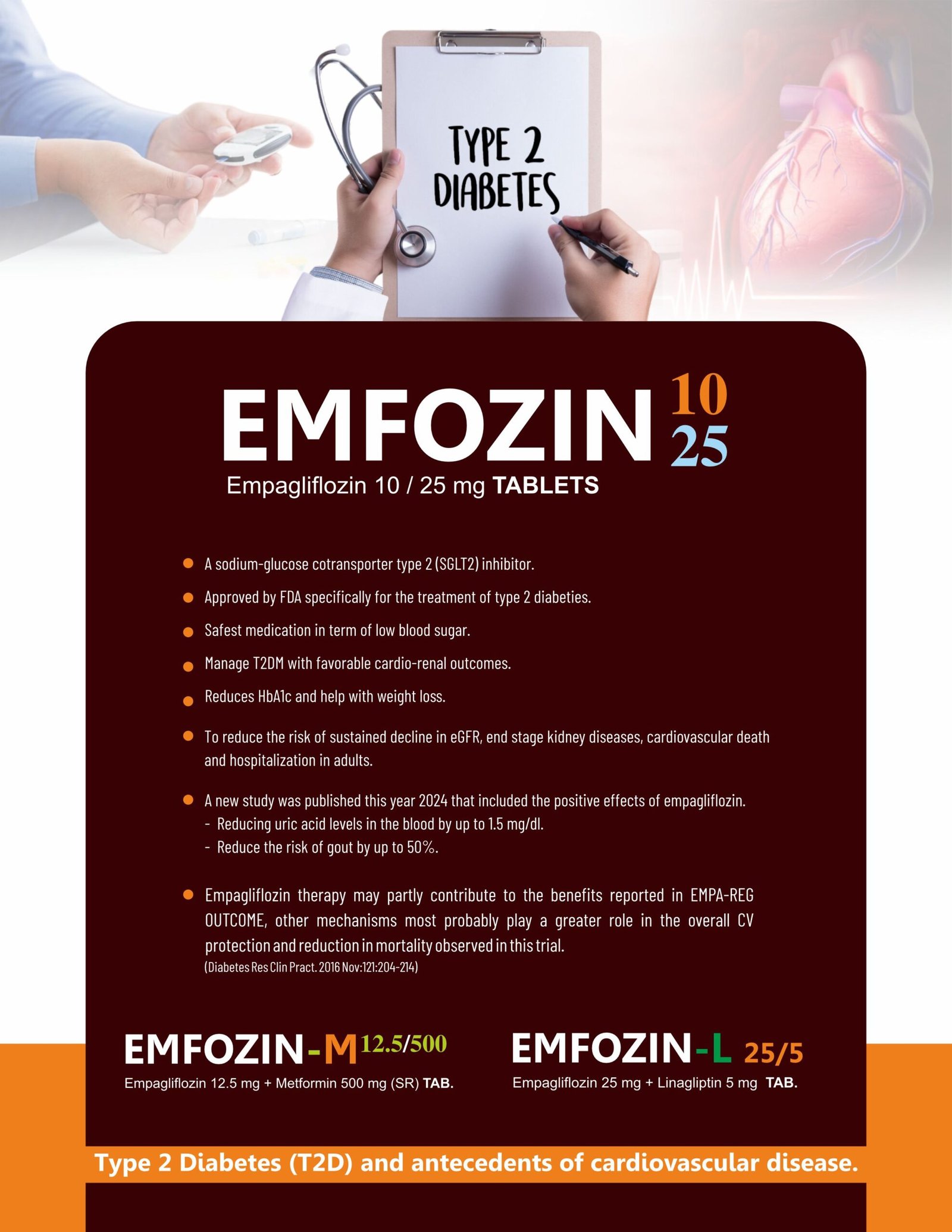 Use: EMFOZIN-25 is an SGLT2 inhibitor indicated for the management of type 2 diabetes mellitus, reduction of cardiovascular death risk, treatment of heart failure, and management of chronic kidney disease.